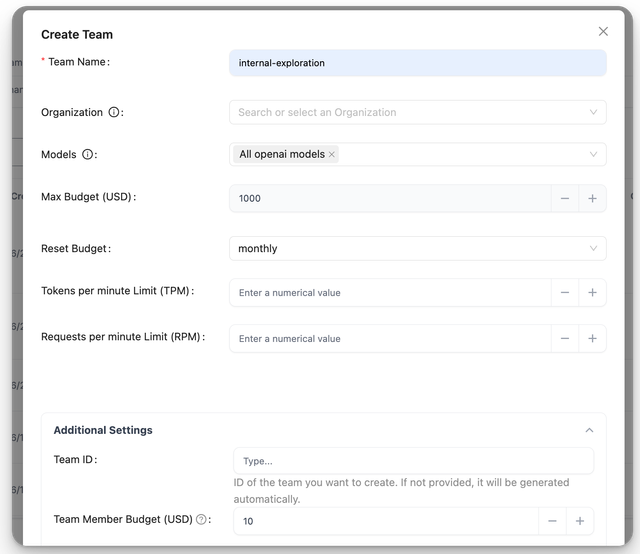 budget_duration: 30d # Optional[str], optional): 30 days budget_duration for the team